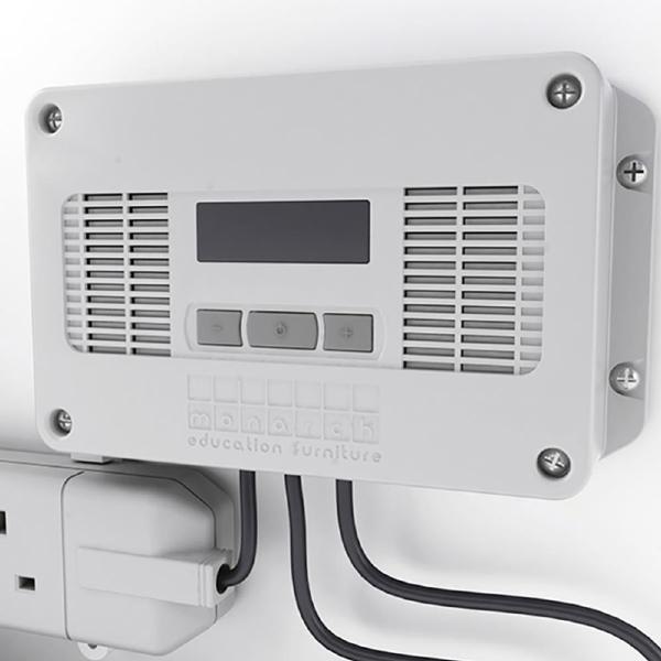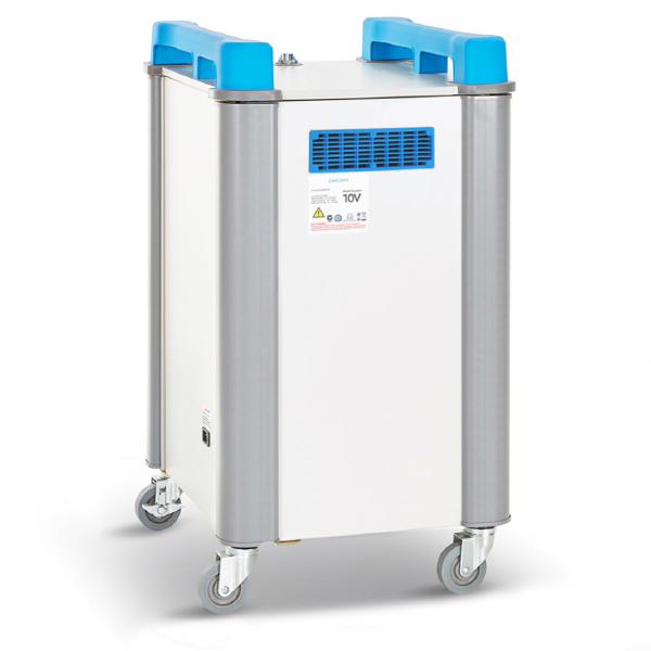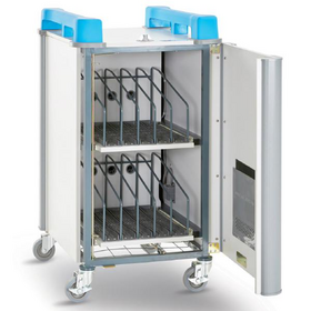 Charges 10 devices up to 17" screen size laptops and Chromebooks,Device adaptors plug into 2 x 5-way power strips designed and manufactured in-house,Sockets accommodate larger adaptors and plugs without blocking adjacent outlets,IEC socket with 1.8m / 6ft power cord designed to snap out if pulled away from the wall to prevent damage,Perfectly designed cable clips secure charging cables to dividing bars to ensure cables is locked in place next to device,Fitted with large all directional swivel, non-marking hospital grade rubber wheels (2 braked),Rounded corners fitted with rubber corner bumpers and extrusions for shock absorption to prevent damage to walls and devices inside,Concealed lever unlocks rear power compartment to enable clear access to cables and AC adaptors when required,Built-in heat sensor will shut off power if a device overheats or if interior temperature reaches 32C/90F degrees to prevent risk of fire or damage to devices,Dual point locking system, with keys provided, to secure at the top and bottom of both device and power compartment to prevent theft, damage or tampering,Device Compartment Size W470 x D350 x T60 mm / 18.5? x 13.8? x 2.4?